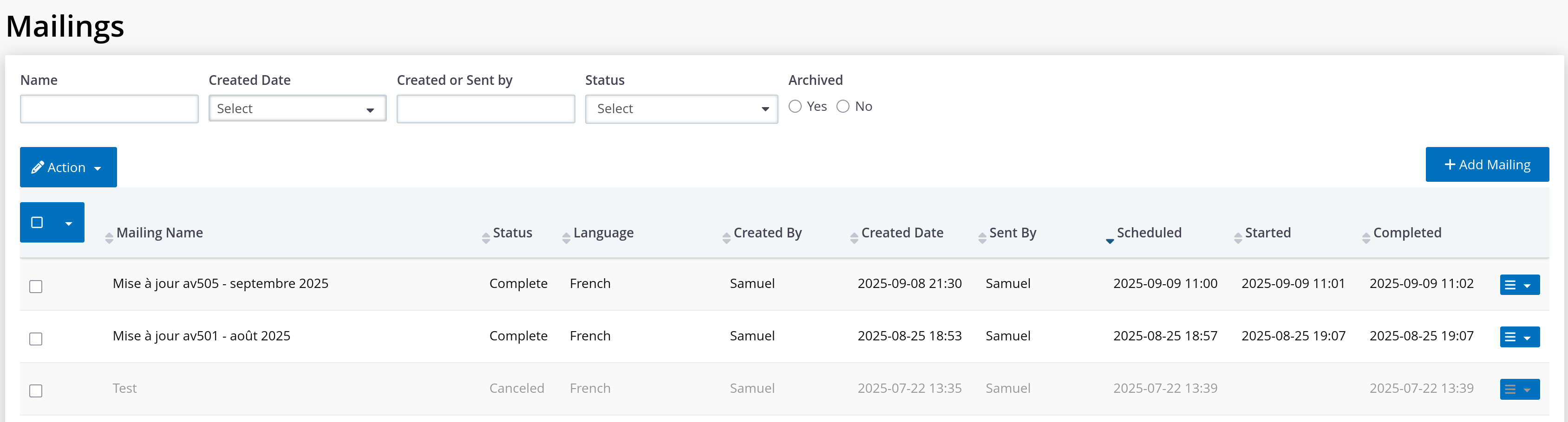 - CiviMail: new interface to browse sent or scheduled mailings (part of the AdminUI extension, it might need to be enabled on your CiviCRM instance).